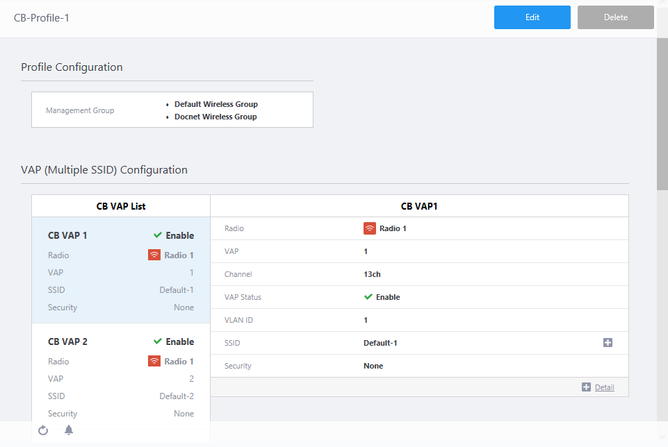 Checkbox Lets you select or deselect CB Profiles. A checkbox in the header row can be used to check or uncheck all CB Profiles. Unchecking the box in the heading row deselects all entries in the list. CB Profile Name Shows the CB Profile name. Management Group Shows the list of Management Groups for the CB Profile. Assigned APs Shows the number of APs to which the CB Profile is assigned. Unapplied APs Shows the number of APs for which pending configuration (AP Profile, CB Profile, SC Profile, or AP-specific configuration) exists. Detail (magnifying glass icon) Shows the "CB Profile Details" page. Refer to Operation Reference > Channel Blanket > Configure CB Profile for a detailed description of the "CB Profile Details" page.