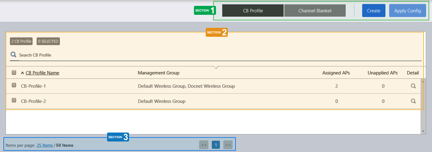 | "Create" button | Shows the page for creating a new CB Profile. Refer to Operation Reference > Channel Blanket > Configure CB Profile for more details. |