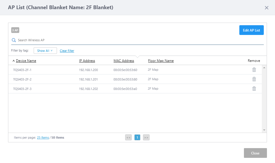 Make sure that the correct APs are selected, then click "Close" to close the "AP List" dialog box.