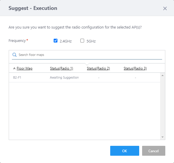 In the "Suggest - Execution" dialog box, you can request optimization suggestions for the target selected in the floor map list or wireless AP list, for each radio band (2.4GHz, 5GHz).