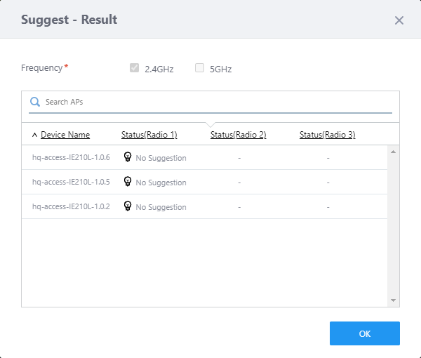 | Frequency | Select a frequency band from one or both of 2.4GHz and 5GHz to execute the suggestion. |