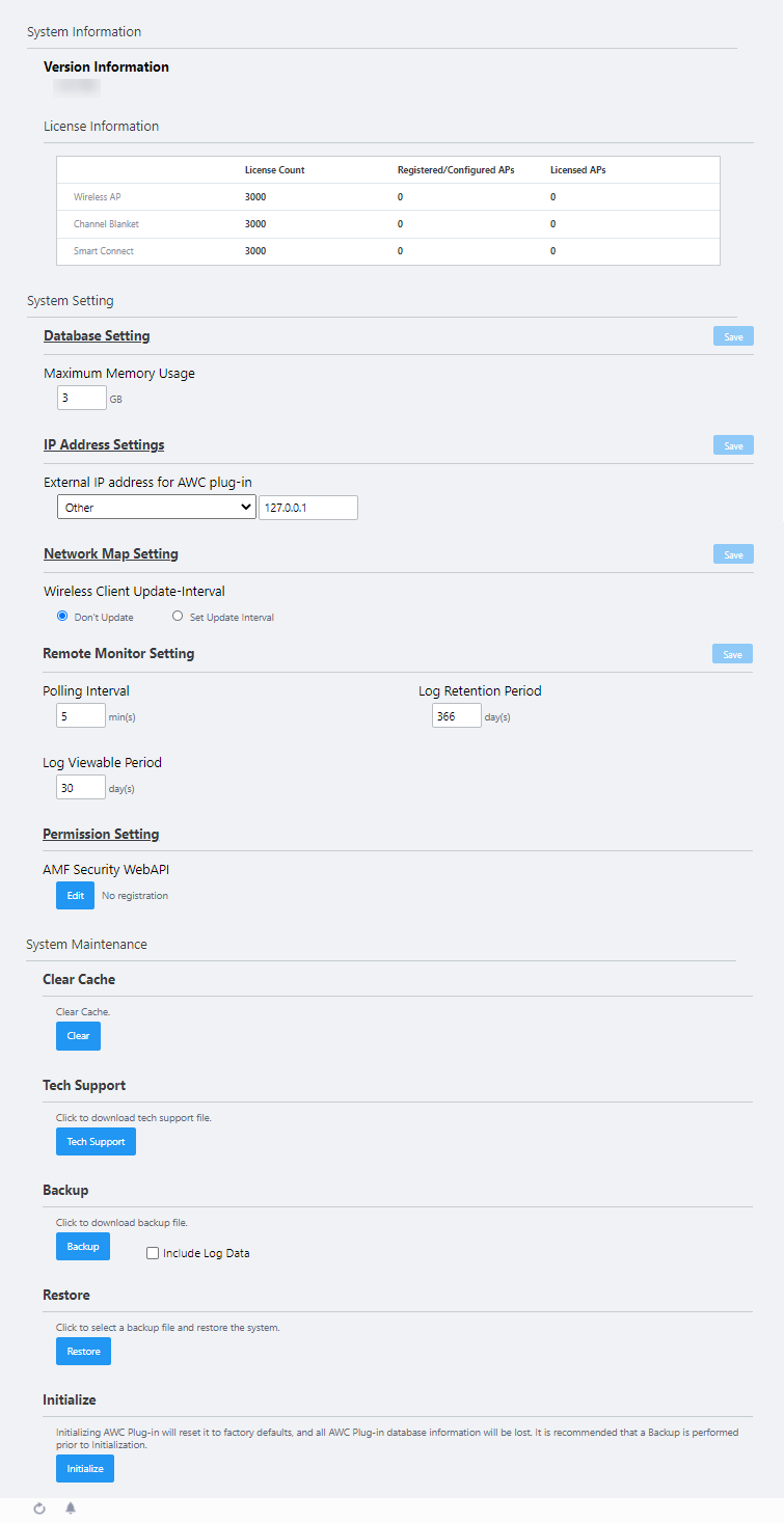 The System Setting page lets you see the AWC Plug-in version, factory-reset the plug-in, and configure system settings.