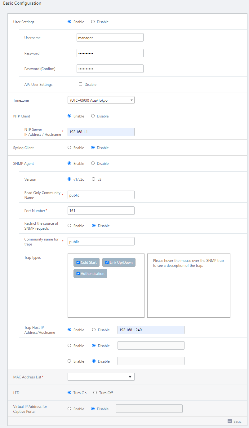 - You can specify the AP's system settings in the "Basic Configuration" section.