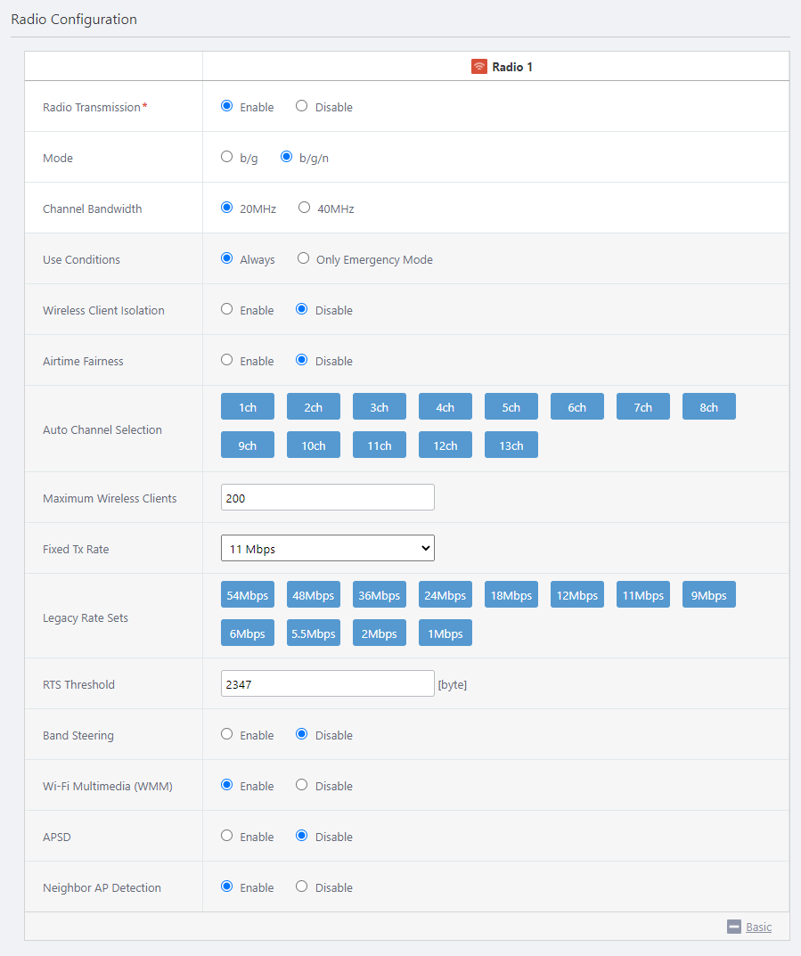 Refer to Enable Emergency Mode for more details.Wireless Client Isolation Disable Disable Specify whether to block communication between wireless clients connected to the same VAP. Airtime Fairness Disable Disable Specify whether to give each client an equal amount of airtime regardless of its speed. Auto Channel Selection All All Specify the channels to use. All channels are selected by default. Maximum Wireless Clients 200 200 Specify the maximum number of clients that can connect to the APs. Fixed Tx Rate 11 Mbps 6 Mbps Specify the fixed Transmission Rate for IEEE 802.3 Multicast/Broadcast. Legacy Rate Sets All rates except 1/2Mbps All Specify valid rates to use when IEEE 802.11b/g or IEEE 802.11a is being used. RTS Threshold 2347 (Disable) 2347 (Disable) To transmit RTS packets in IEEE 802.11b/g/a mode, select Enable and specify the minimum size of Tx packets. Specifying "2347" disables RTS transmission. Band Steering