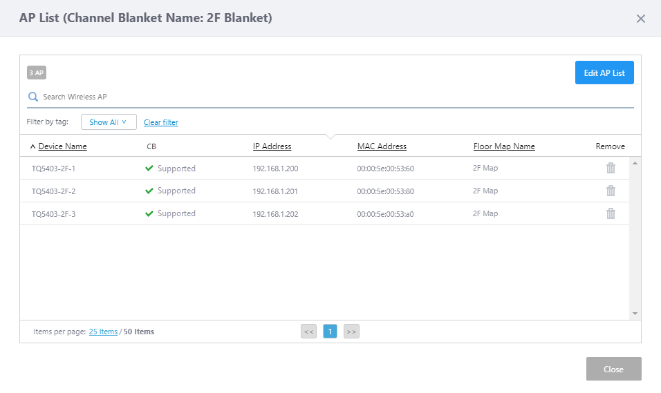 Make sure that the correct APs are selected, then click "Close" to close the "AP List" dialog box.