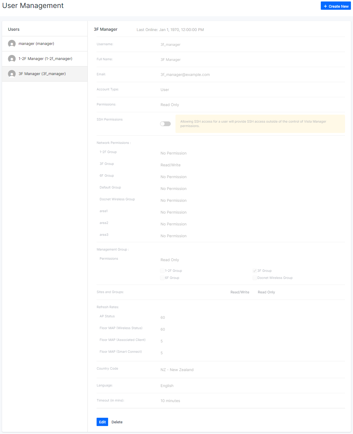 This option is not displayed when the Account Type is set to "Admin". You can edit all management groups and manage the floor maps, associated APs, and profiles they belong to.