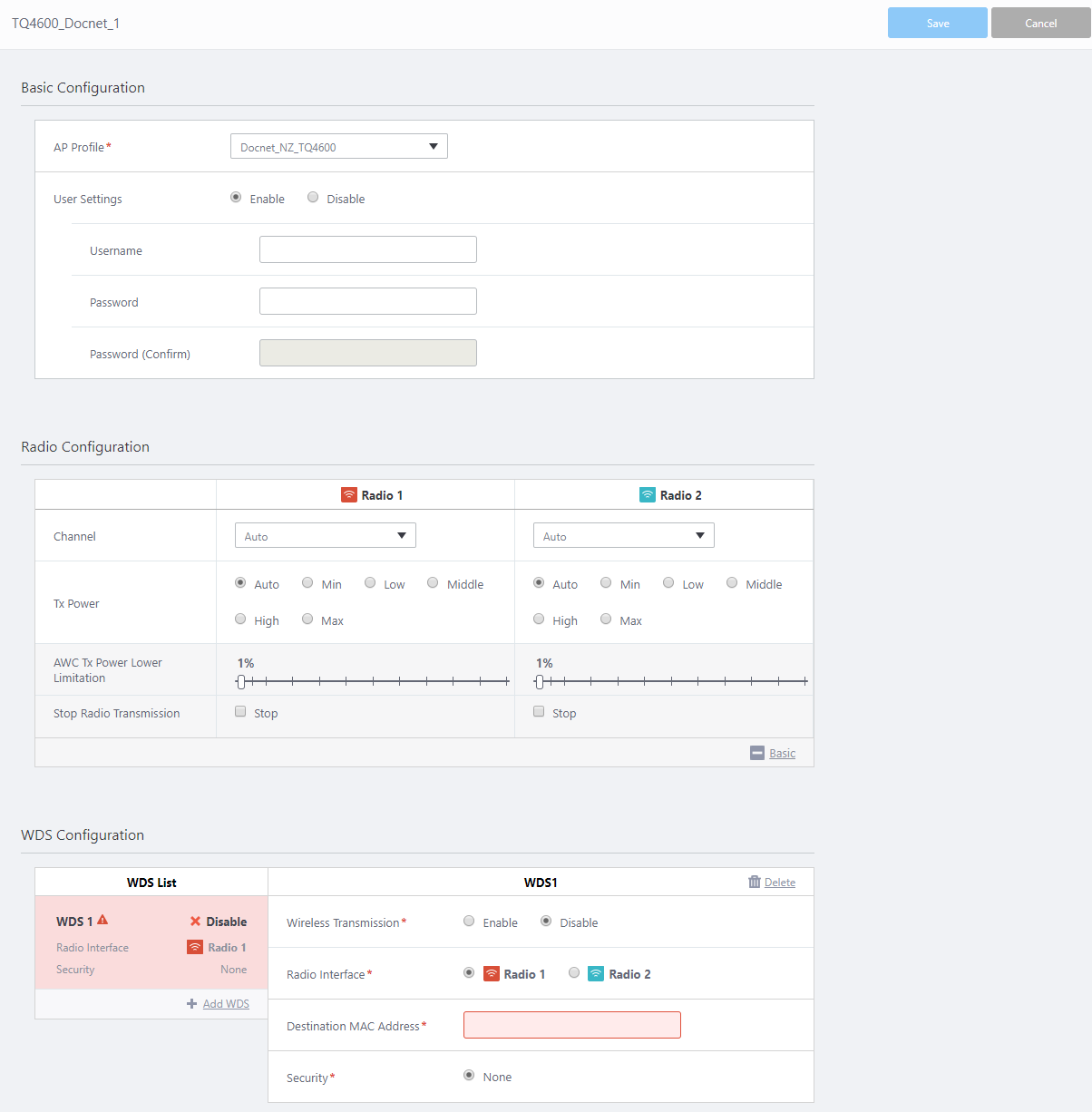 NoteIf you add an AP that has been configured for WDS through its own management web interface, re-configure WDS on the "AP-specific configuration" page before applying an AP Profile to the AP.