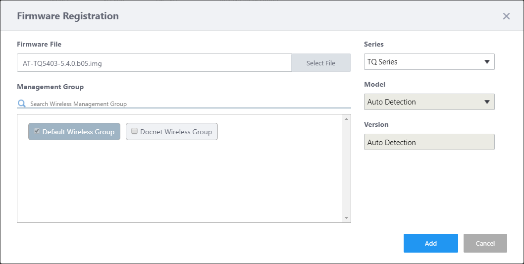 - Select the Management Groups whose member APs can use the firmware file and a series for which the firmware file is built.