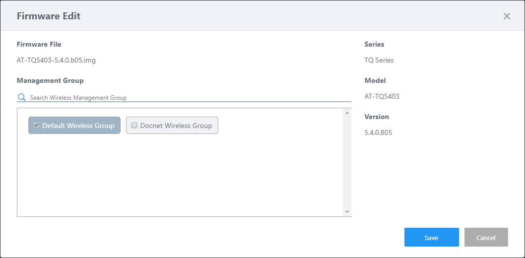 Series Shows the series of APs for which the firmware file is built. Model Shows the models of APs for which the firmware file is built. Version Shows the version of the firmware file. "Save" button Save the change to the Management Groups. "Cancel" button Discard the change to the Management Groups.