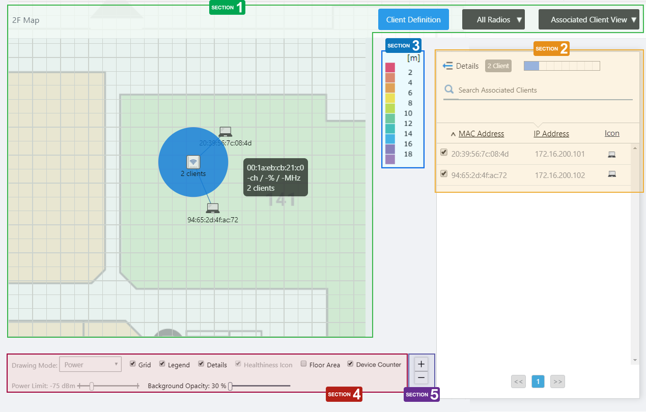 NoteEven between wireless APs operating at the same radio strength, the size of output circle on the heat map may vary depending on the installation location and other factors.