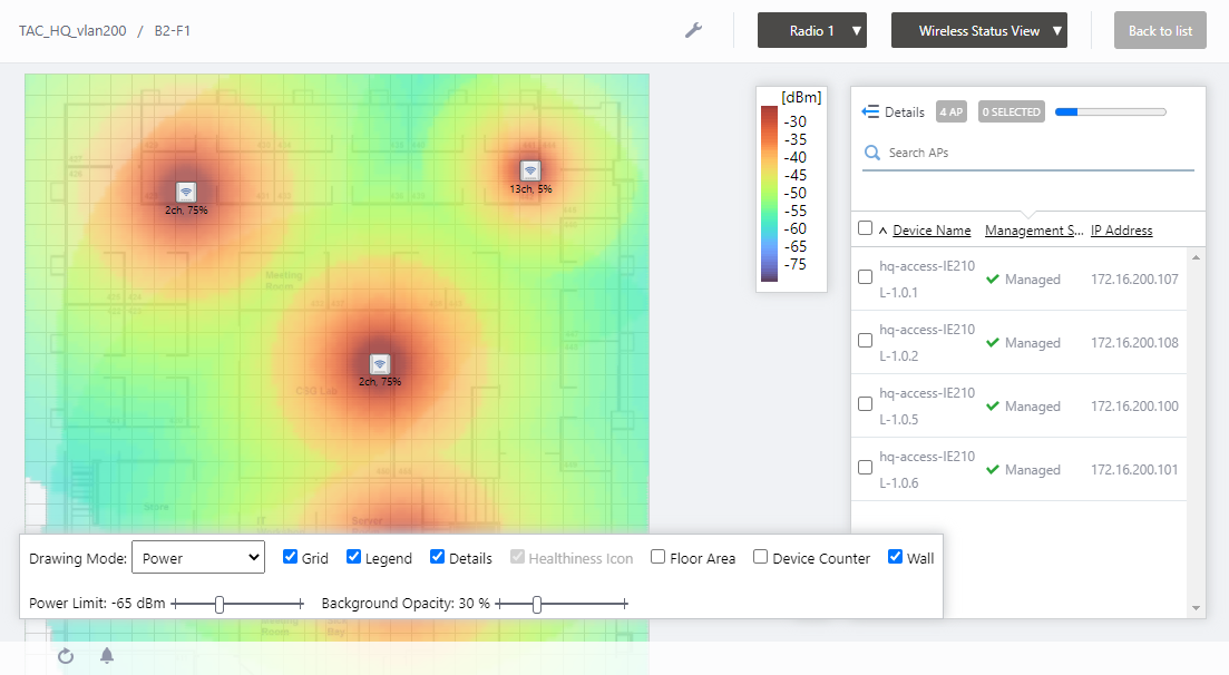 | Drawing Mode | Lets you select what to show on the heatmap. Options are power (signal strength) and channel. |