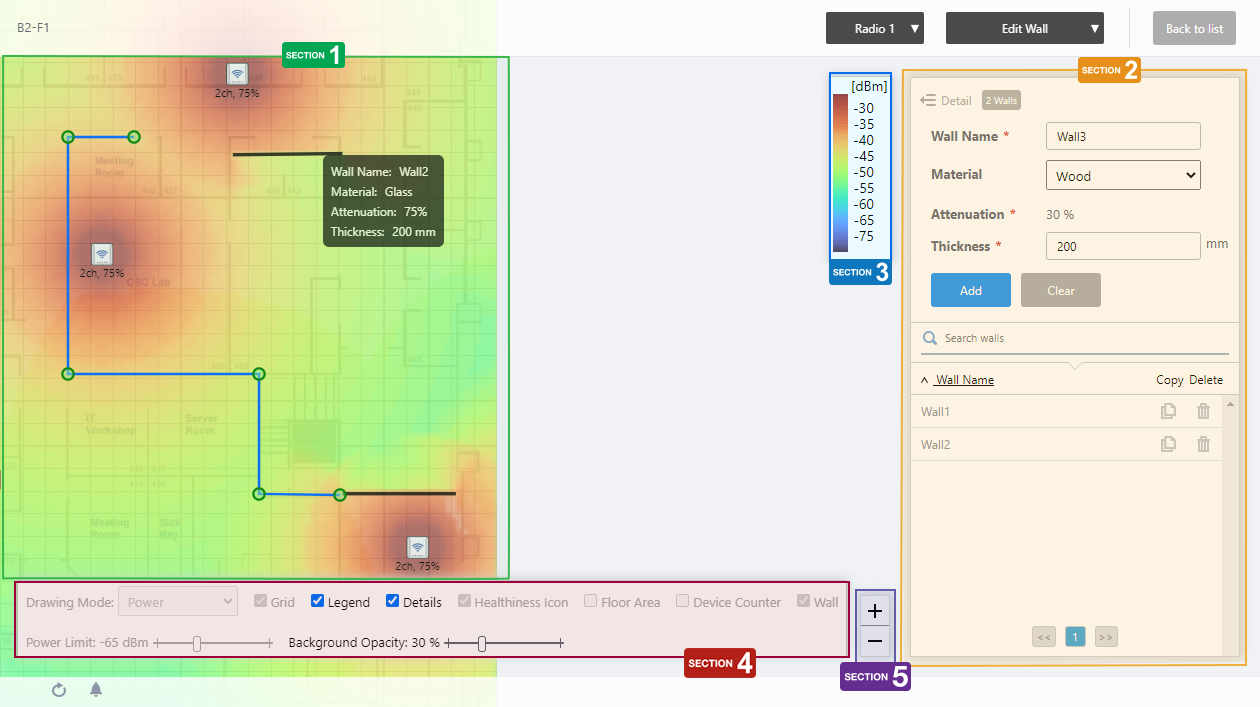 You can draw walls with polylines to simulate radio attenuation by walls, partitions, and pillars on the floor map.