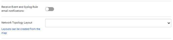 Item Name Value Description Receive Event and Syslog Rule email notifications Disable Specify whether to receive email notifications to the relevant account when email notification is configured in an Event Rule or Syslog Rule. Network Topology Layout (blank) Select the layouts you want to apply to the network map at first login or allow to be applied thereafter.