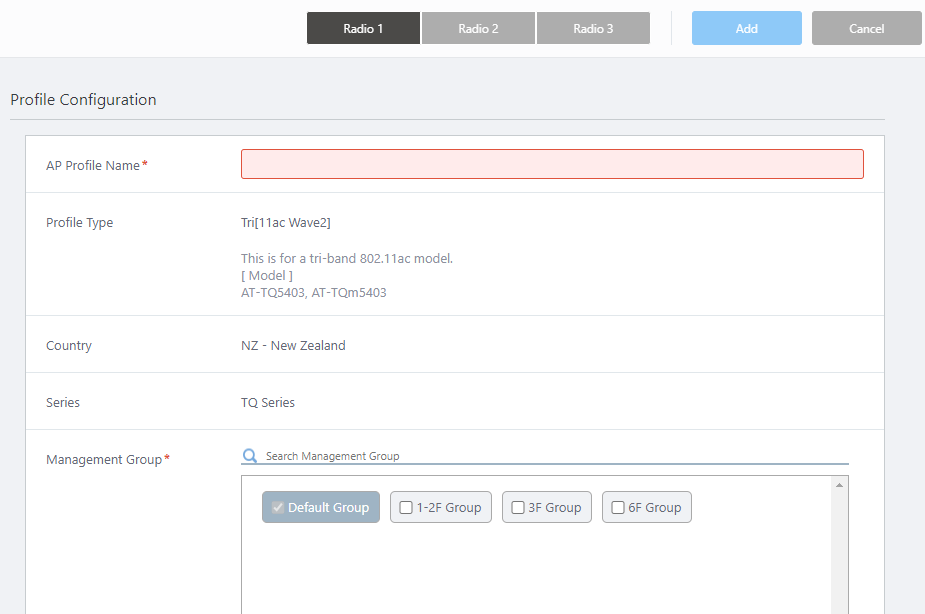 Depending on the selected "Profile Type", configure "Radio 1 (2.4GHz)", "Radio 2 (5GHz W52/W53)" and "Radio 3 (5GHz W56)" appropriately. You can switch the radio by clicking the "Radio 1", "Radio 2" and "Radio 3" buttons at the top of the screen.