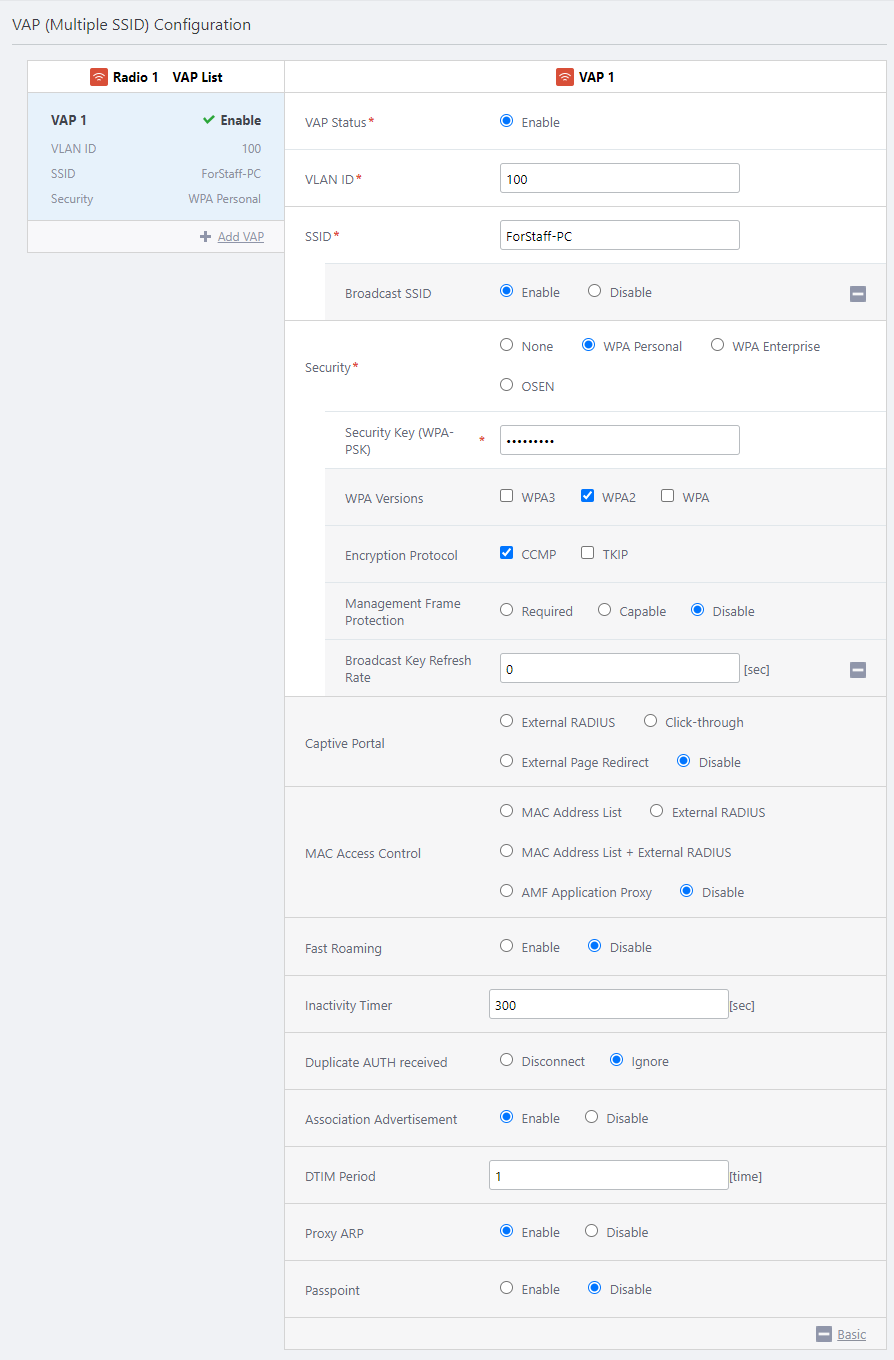 SSID ForStaff-PC Specify an SSID (network name) to use on the VAP. Broadcast SSID Enable Specify whether to broadcast the SSID on the VAP. Security WPA Personal Specify a security method for the VAP. Security Key (WPA-PSK) 5+@f/=0N1y Specify an encryption key for the VAP. WPA Versions WPA2 Specify a WPA version to use on the VAP. Encryption Protocol CCMP Specify an encryption protocol to use on the VAP. Management Frame Protection (MFP) Disable Specify whether to protect Management Frames. Broadcast Key Refresh Rate 0 Specify an interval at which to refresh the broadcast key that is sent to clients on the VAP. Specifying "0" stops the key from refreshing. Captive Portal Disable Specify whether to use the Captive Portal feature on the VAP. MAC Access Control Disable Specify whether to use MAC Access Control on the VAP. Fast Roaming Disable Specify whether to use Fast Roaming of wireless clients. Inactivity Timer 300 Specify the delay before disconnecting a client that disappears without notifying the APs. Duplicate AUTH received Ignore Select how to process connection requests from clients that have maintained a connection. Association Advertisement Enable Specify whether to use Association Advertisement. DTIM Period 1 Specify how frequently to insert a DTIM (Delivery Traffic Indication Map) in the AP's beacons (every 1 to 255 beacons). Proxy ARP