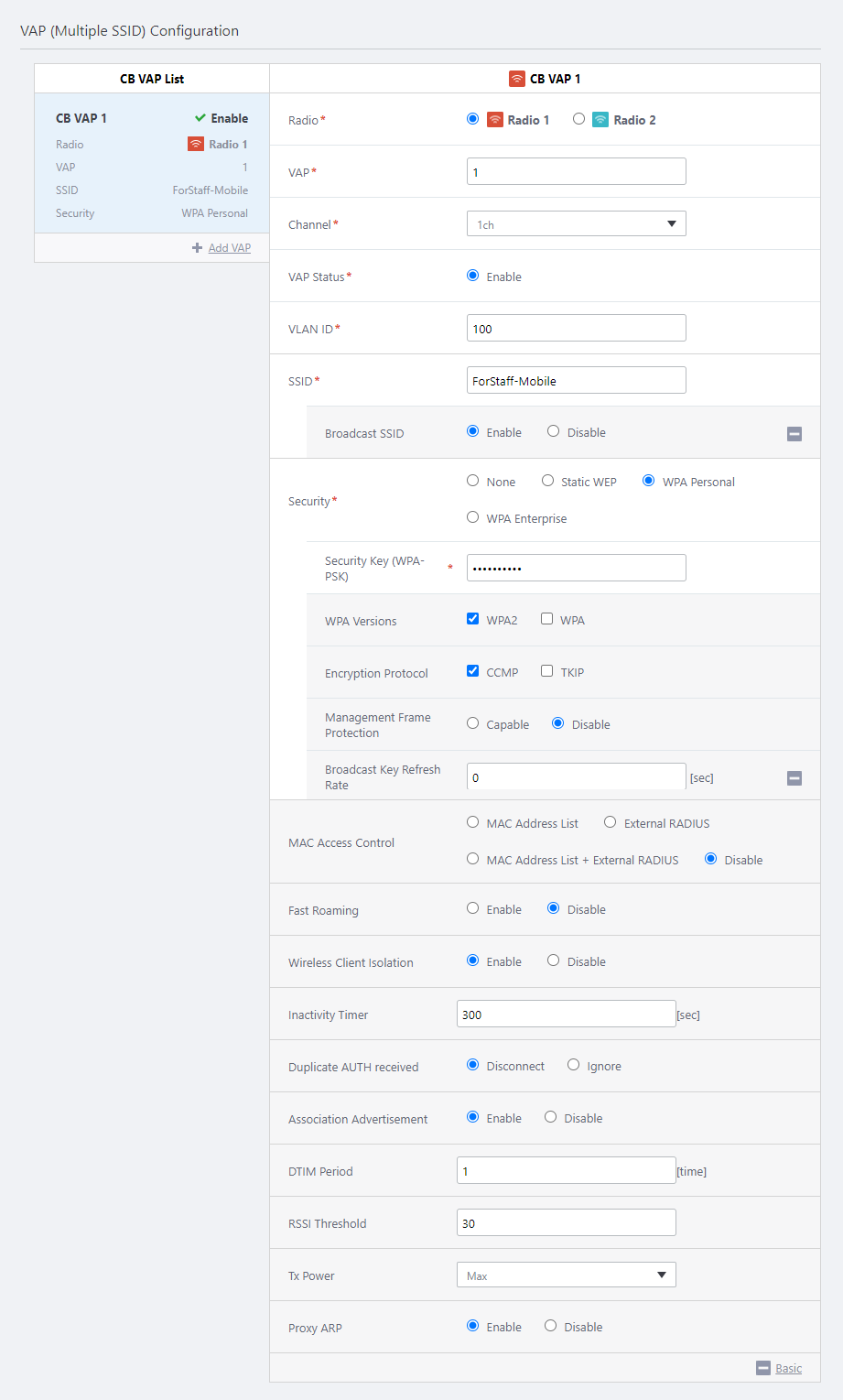 SSID ForStaff-Mobile Specify an SSID (network name) to use on the CB VAP. Broadcast SSID Enable Specify whether to broadcast the SSID on the CB VAP. Security WPA Personal Specify a security method for the VAP. Security Key (WPA-PSK) 5+@f/=0N1y Specify an encryption key for the VAP. WPA Versions WPA2 Specify a WPA version to use on the VAP. Encryption Protocol CCMP Specify an encryption protocol to use on the VAP. Management Frame Protection (MFP) Disable Specify whether to protect Management Frames. Broadcast Key Refresh Rate 0 Specify an interval at which to refresh the broadcast key that is sent to clients on the VAP. Specifying "0" stops the key from refreshing. MAC Access Control Disable Specify whether to use MAC Access Control on the VAP. Fast Roaming Disable Specify whether to use Fast Roaming of wireless clients. Wireless Client Isolation