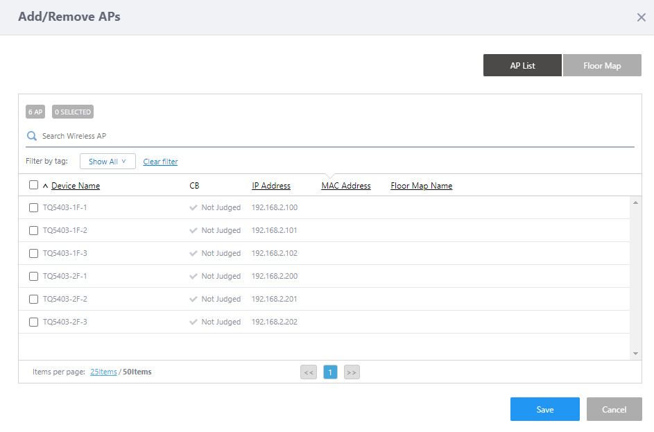 - Click "Save" in the "Add/Remove APs" dialog box to save the selection.