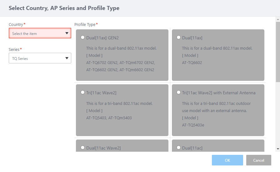 This item is displayed if you select "TQ Series" or "TQ Series - SDN/OpenFlow" for Series, and "Dual[11ax] GEN2", "Dual[11ax]", "Dual[11ac]", "Dual[11n]", "11ac With External Antenna" or "Single" for Profile Type.