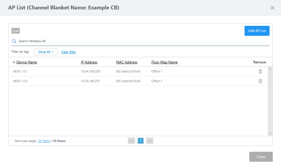 IP Address Shows the AP's IP address. MAC Address Shows the device's MAC address. Floor Map Name Shows a floor map name where the AP is placed. Remove (Trashbin icon) Lets you remove the AP from the channel blanket. "Close" button Closes the "AP List" dialog box and goes back to the "Edit CB Profile" page.