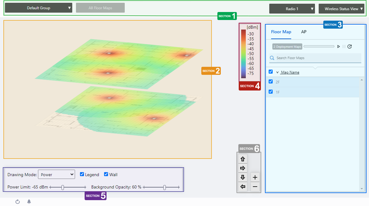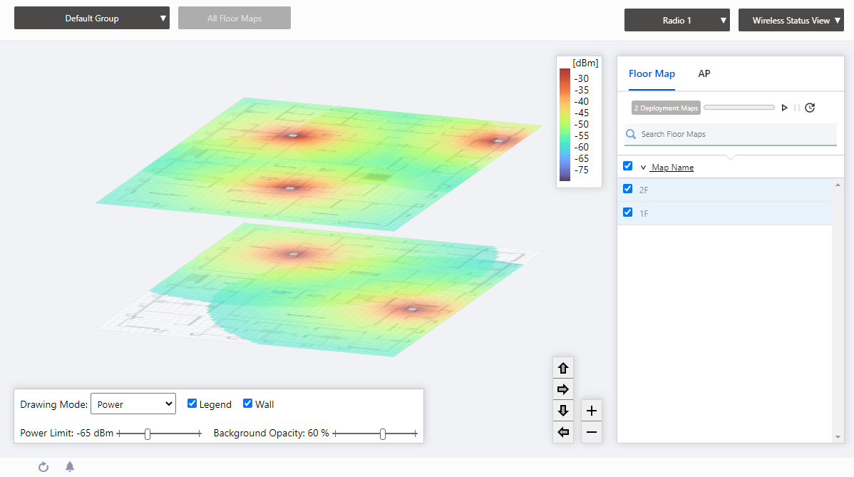 Each floor map displays the icons of the APs placed in the individual floor map detail screen, a heat map showing the channel or signal reach and strength in color around the wireless APs, and the areas or walls you have created.