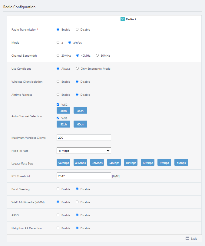 Refer to Enable Emergency Mode for more details.Wireless Client Isolation Disable Disable Specify whether to block communication between wireless clients connected to the same VAP. Airtime Fairness Disable Disable Specify whether to give each client an equal amount of airtime regardless of its speed. Auto Channel Selection All All Specify the channels to use. All channels are selected by default. Maximum Wireless Clients 200 200 Specify the maximum number of clients that can connect to the APs. Fixed Tx Rate 11 Mbps 6 Mbps Specify the fixed Transmission Rate for IEEE 802.3 Multicast/Broadcast. Legacy Rate Sets All All Specify valid rates to use when IEEE 802.11b/g or IEEE 802.11a is being used. RTS Threshold 2347 2347 If the packet to be transmitted is larger than this size in IEEE 802.11b/g/a, an RTS packet is transmitted before transmitting the packet.