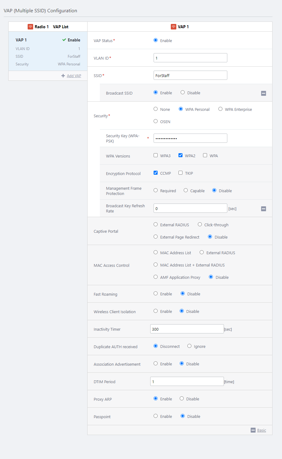 In this example, we will configure a multi-channel network VAP "ForStaff" in VAP1 on Radio 1.