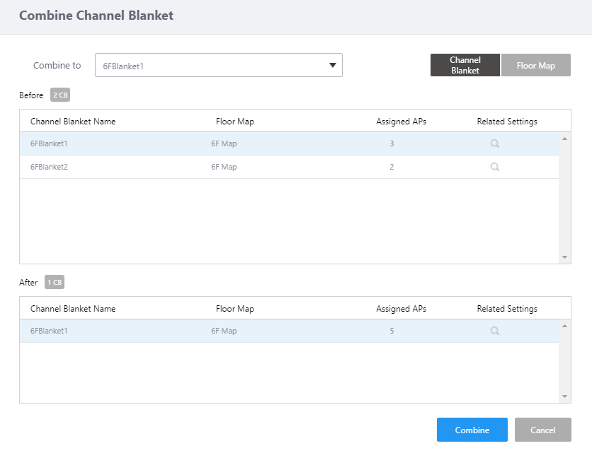 In addition, by selecting "Floor Map" from the "Combine Channel Blankets" dialog's upper right display format button, you can see a color-coded image of the channel blankets to which the APs belong after the combination.