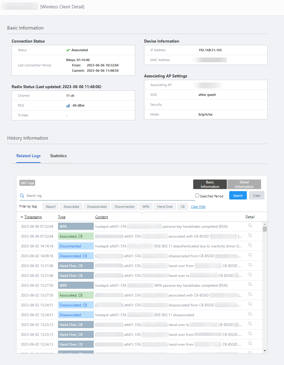 | Associating AP | Shows the device name of the AP the client is associated with. |