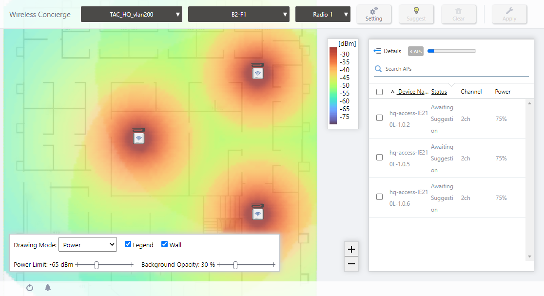 | Status (Radio 1 / Radio 2 / Radio 3) | Displays the suggestions status for the floor map or wireless APs.