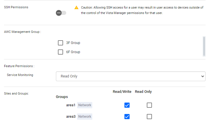Permission controls on Vista Manager EX do not apply to operations in the CLI via SSH. In other words, when the SSH Permission is On, the user of the account can make configuration changes via the SSH to all AMF devices on the AMF network.