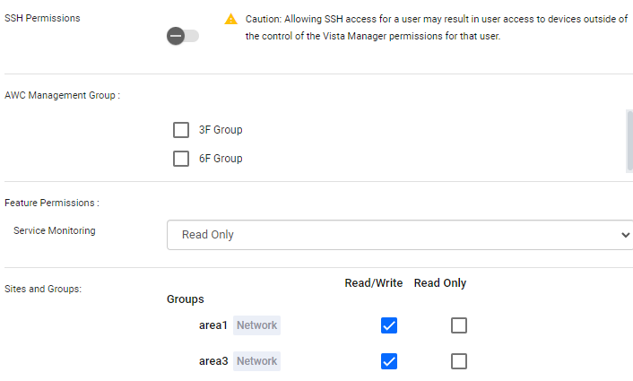 Permission controls on Vista Manager EX do not apply to operations in the CLI via SSH. In other words, when the SSH Permission is On, the user of the account can make configuration changes via the SSH to all AMF devices on the AMF network.