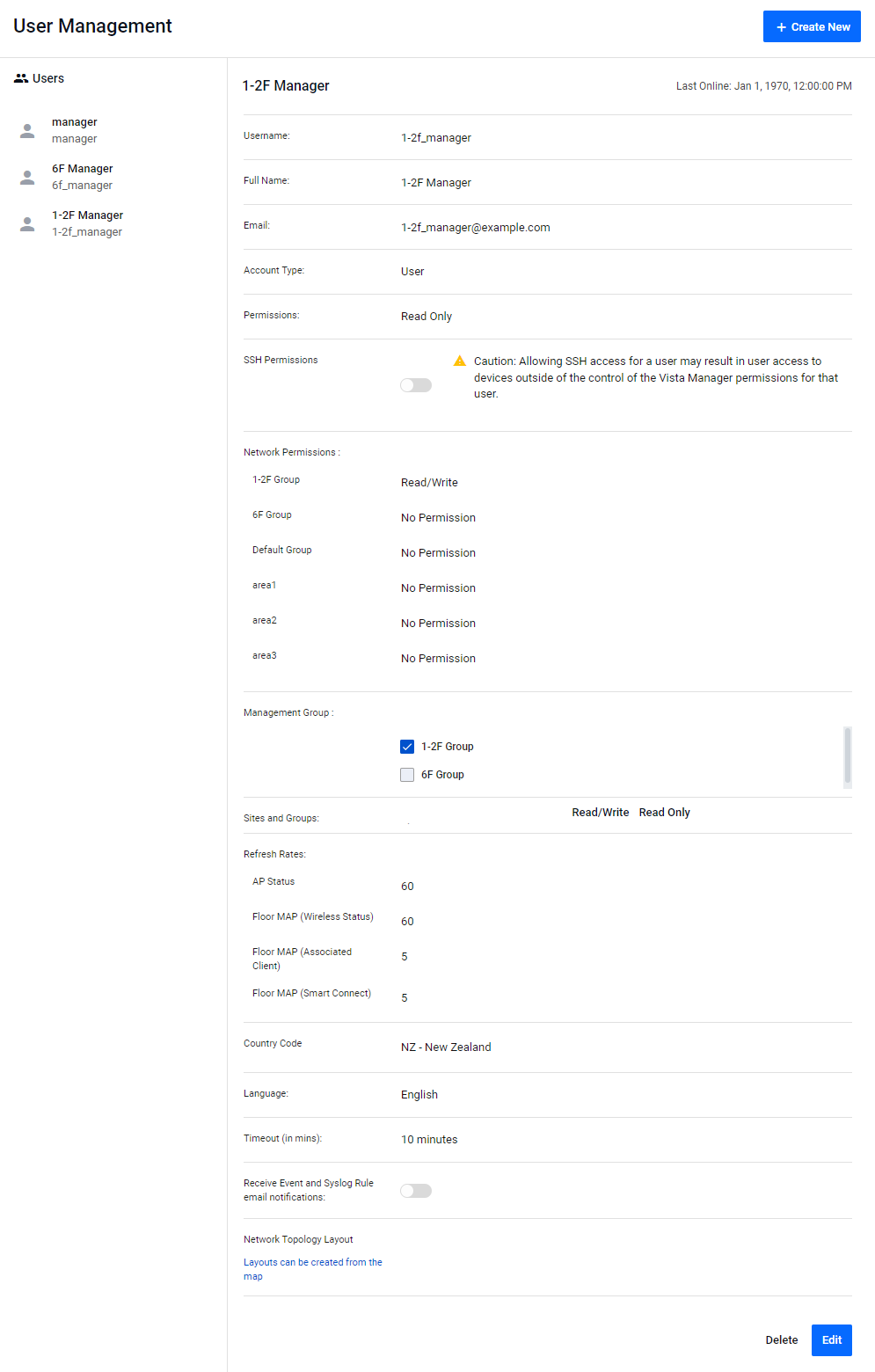 This option is not displayed when the account type is set to "Admin". You can edit all management groups and manage the floor maps, associated APs, and profiles they belong to.