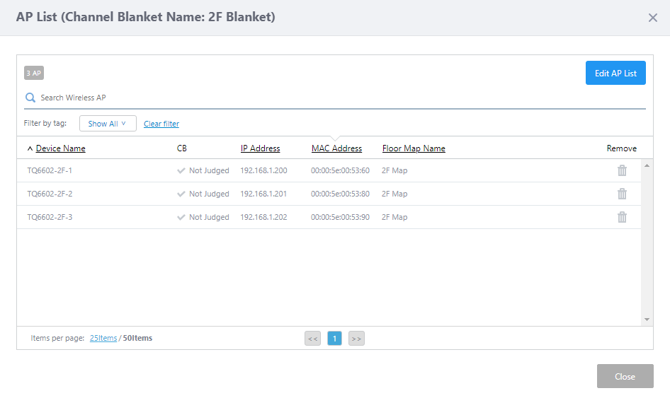 In the title, the channel blanket name follows "AP List", in brackets. In this case, the title is "AP List (Channel Blanket Name: 1F Blanket)".