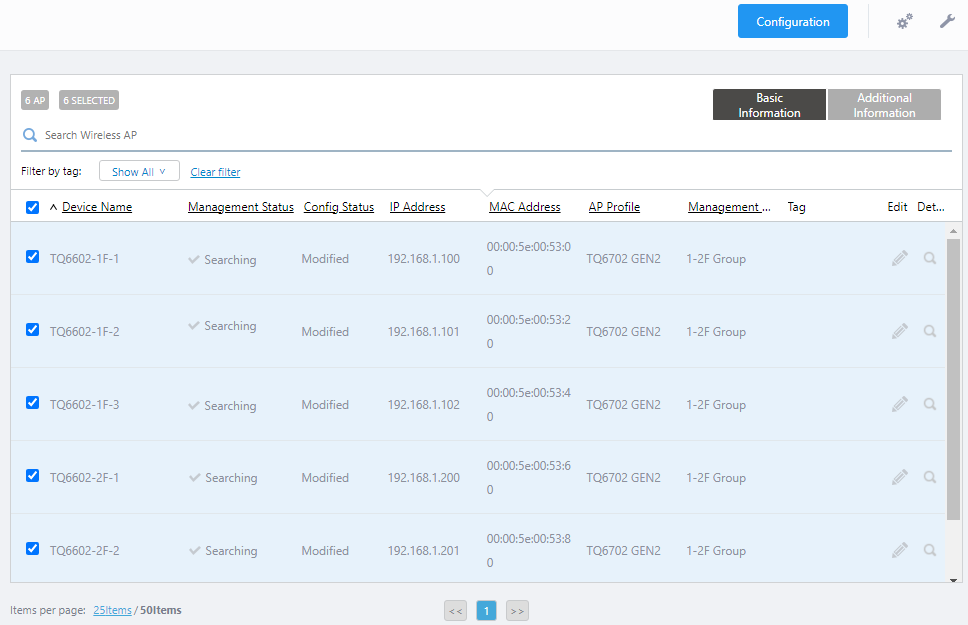 - On the AP list screen, you can see that the target APs' "Management Status" and "Configuration Status" were changed to "Searching" and "Modified" respectively.