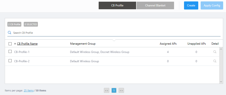Checkbox Lets you select channel blankets. A checkbox in the header row can be used to check or uncheck all channel blankets. Unchecking the box in the heading row deselects all entries in the list. CB Name Shows the name of the channel blanket. CB Profile Name Shows the CB Profile name on which the channel blanket is based. Management Group Shows the list of Management Groups for the CB Profile. Assigned APs Shows the number of APs which the CB Profile is assigned to. Unapplied APs Shows the number of APs for which pending configuration (AP Profile, CB Profile, SC Profile, or AP-specific configuration) exists. Details (magnifying glass icon) Shows the "CB Profile Details" page. Refer to the Operation Reference > Channel Blanket > Create Channel Blanket" > "View Channel Blanket Information section for more details on the "CB Profile Details" page. - Select the CB Profiles to whose member APs you want to apply the pending configuration.