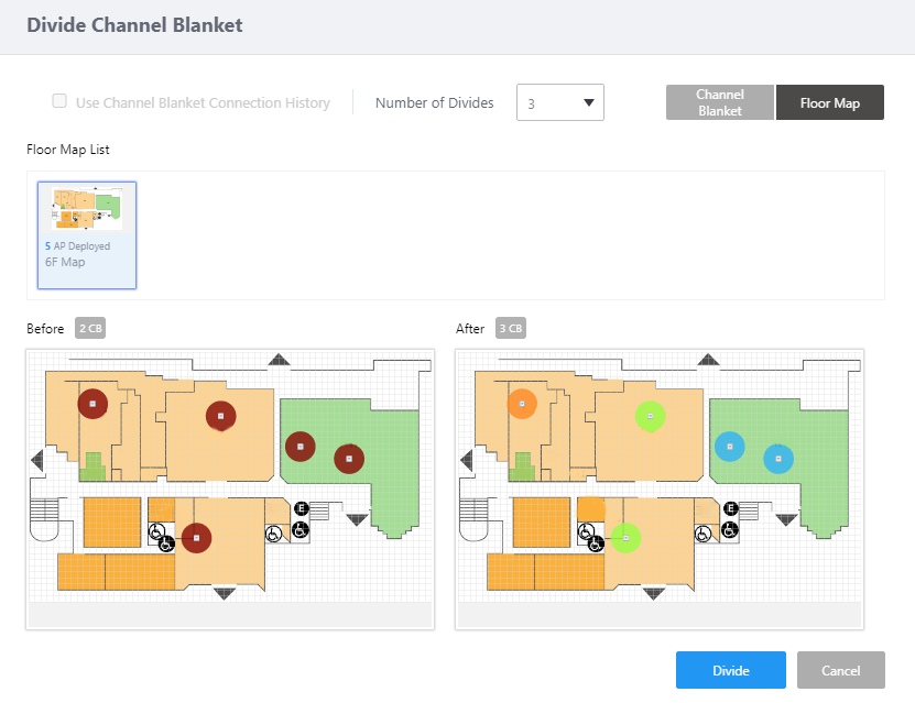 In addition, by selecting "Floor Map" from the "Divide Channel Blanket" dialog's upper right display format button, you can see a color-coded image of the channel blankets to which the APs belong after the division.