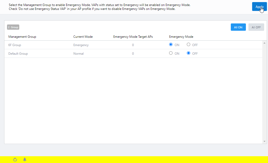 To disable Emergency Mode on APs in all Management Groups, click the "All OFF" button.