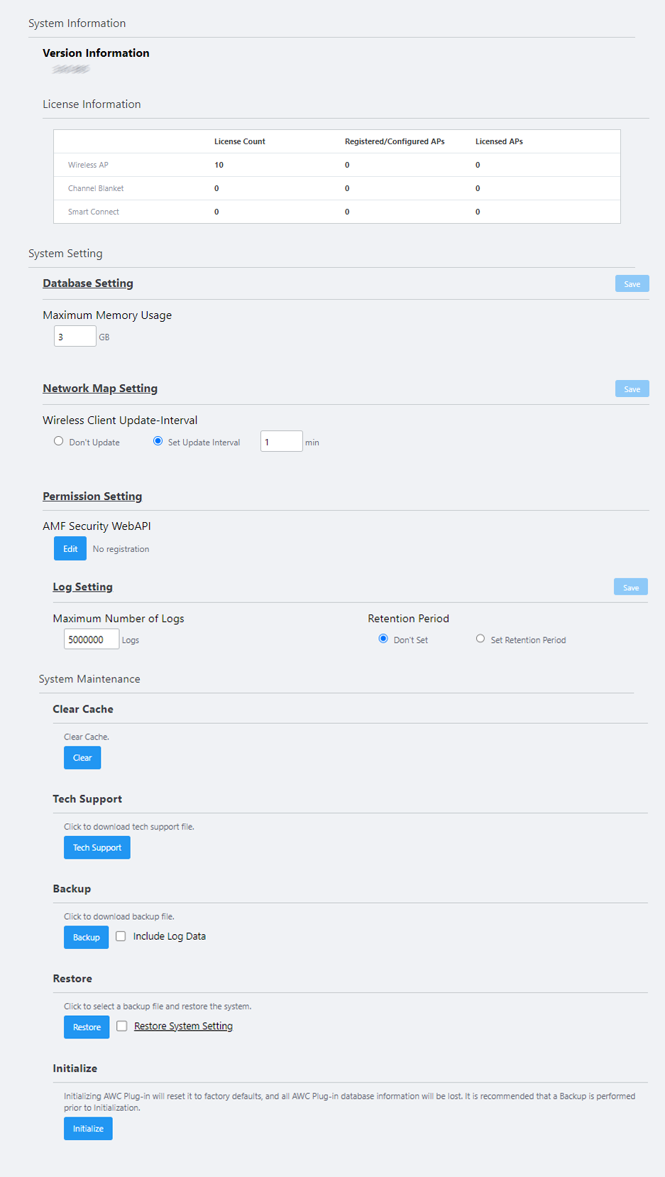 | Restore System Setting | If checked, system settings are restored from a backup file, together with management information such as APs and floor maps. By default, this option is not checked. System Configuration includes the following: