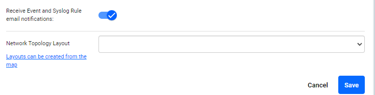 - Set the email notifications about Event and Syslog rules, and the network topology layout.