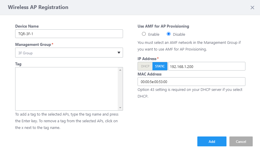 - Enter the "MAC Address" of the AP to be added as "TQR-3F-1".