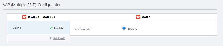 As with "Radio Configuration", in this section, create the same number of VAPs for each radio band as the VAPs configured in the CLI or Web GUI of the wireless router itself.