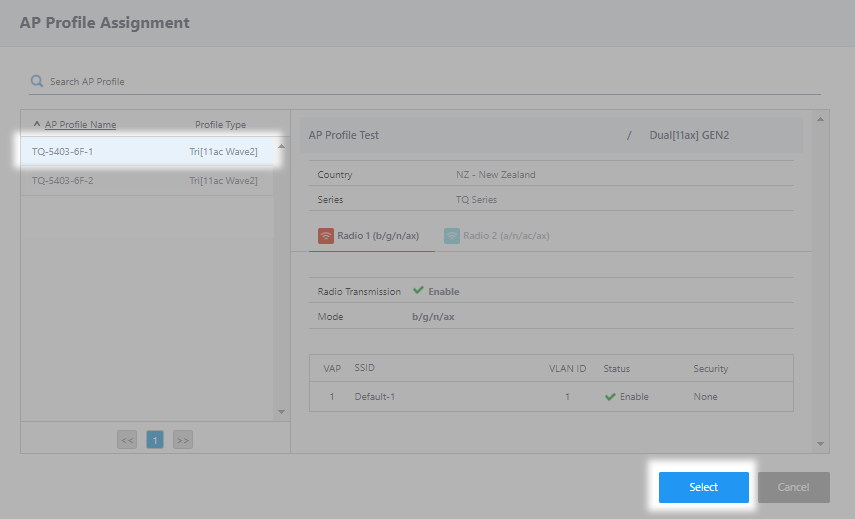 - Select an AP Profile that has been assigned to the AP and click "Select".