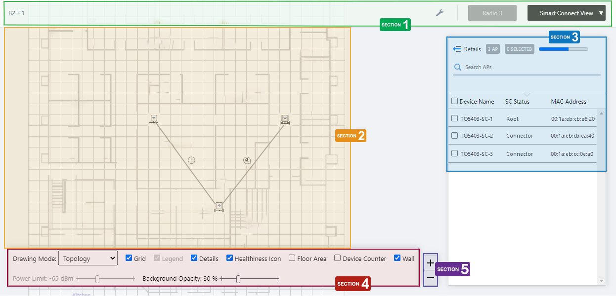 - You can see the logical connections between the wireless APs by selecting "Topology" from the "Drawing Mode" dropdown menu in the floor map control.
