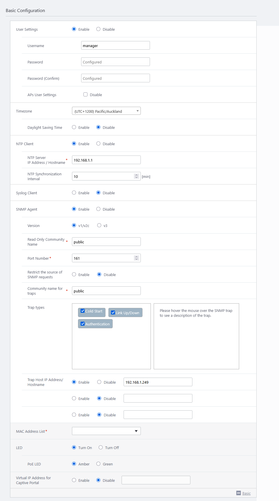 - You can specify the AP's system settings in the "Basic Configuration" section.