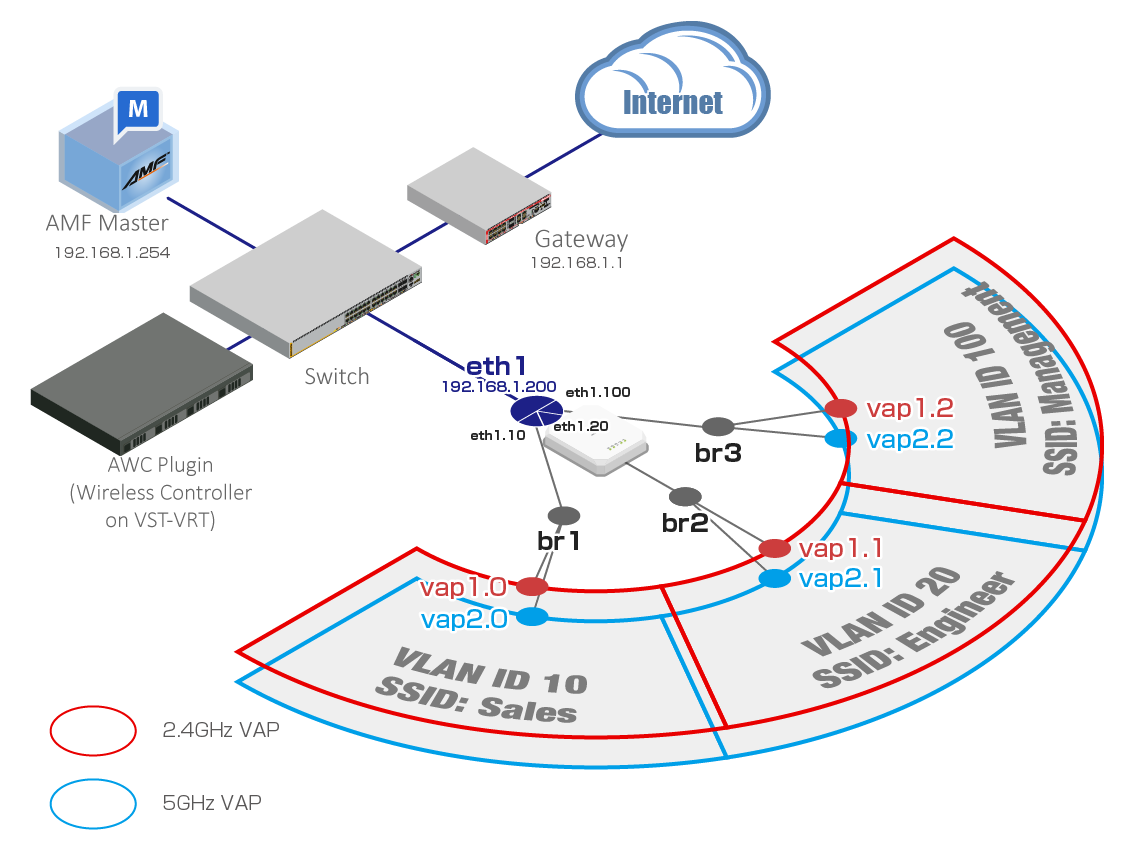 Each VAP communicates with the wired network side via a bridge interface. In this case, an 802.1Q Ethernet subinterface is created on eth1 interface in order to send and receive communications from the VAPs as packets with different VLAN tags.