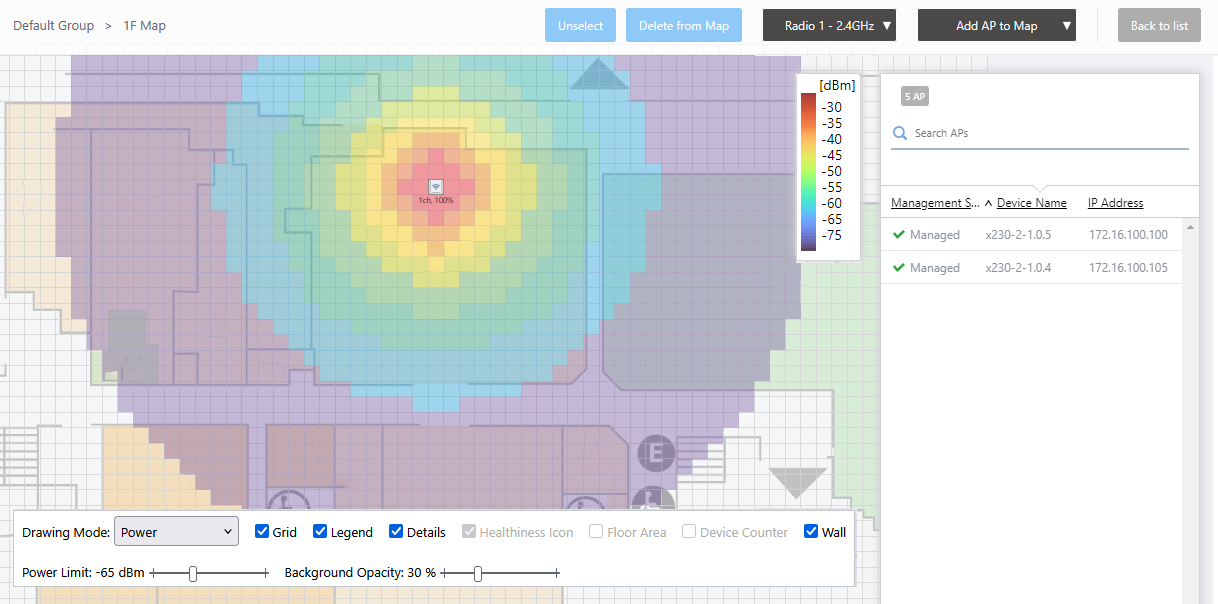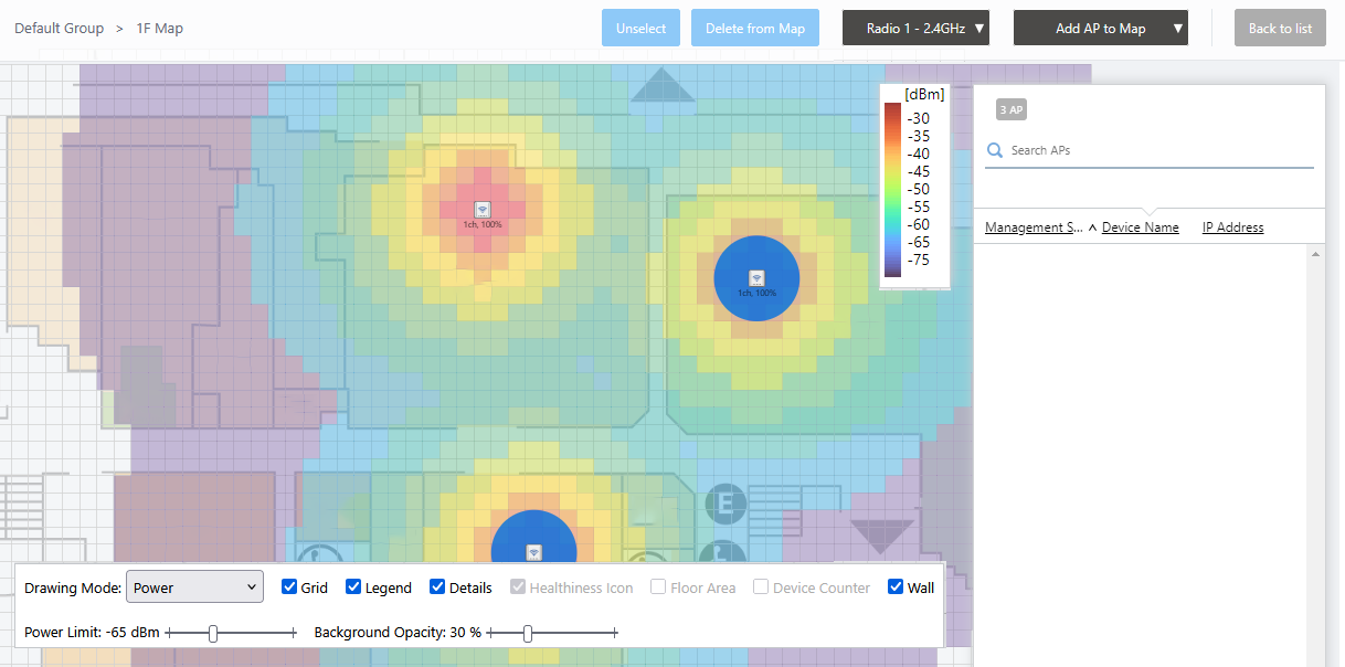 The heatmap calculates the radio signal strength at a given point from an AP's transmit power and the distance between the AP and the point. Because it assumes that there are no obstacles and reflection between the AP and the point, the actual radio signal strength may differ from the heatmap's calculation.