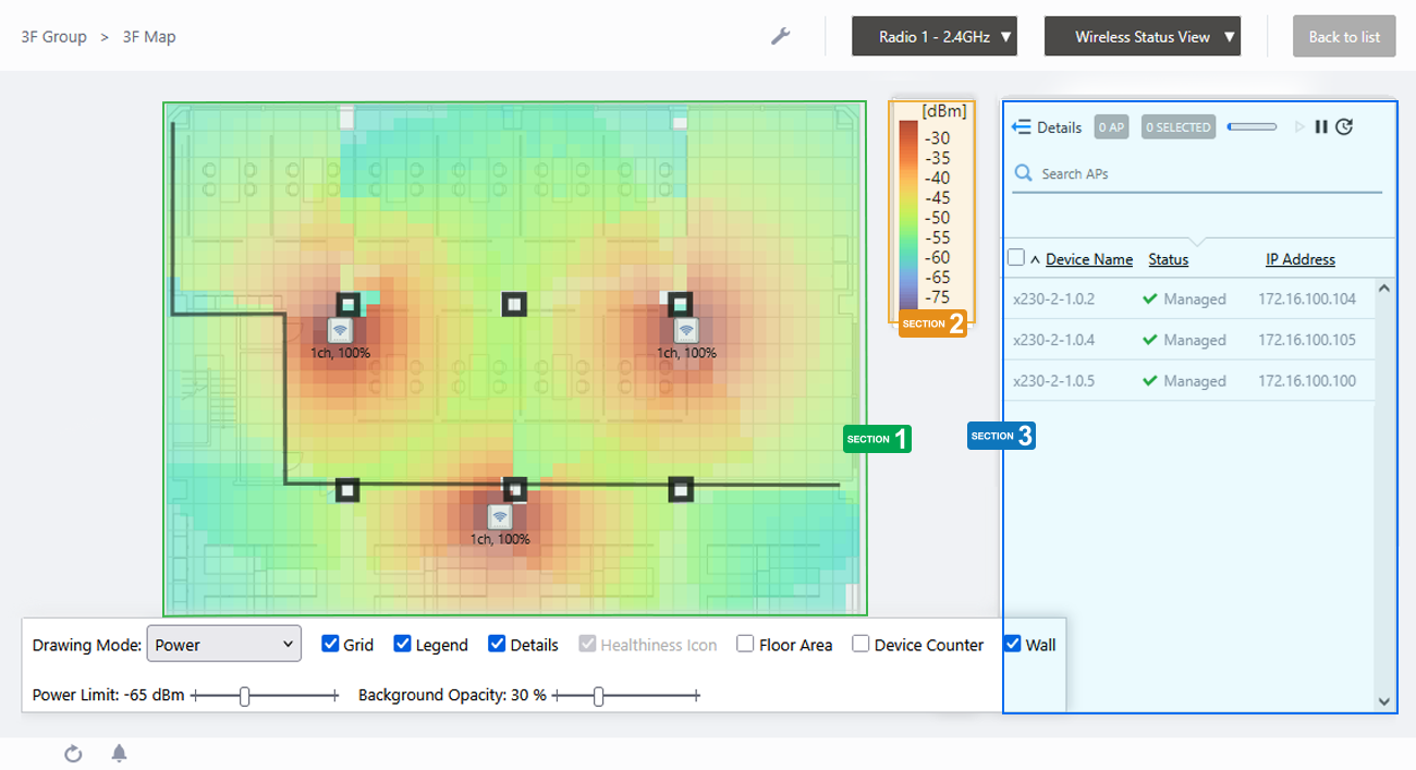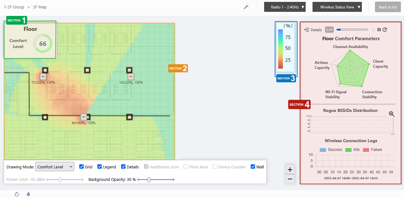 In the floor map control described below, you can switch between Comfort Level, Power, and Channel modes from the Drawing Mode drop-down menu.