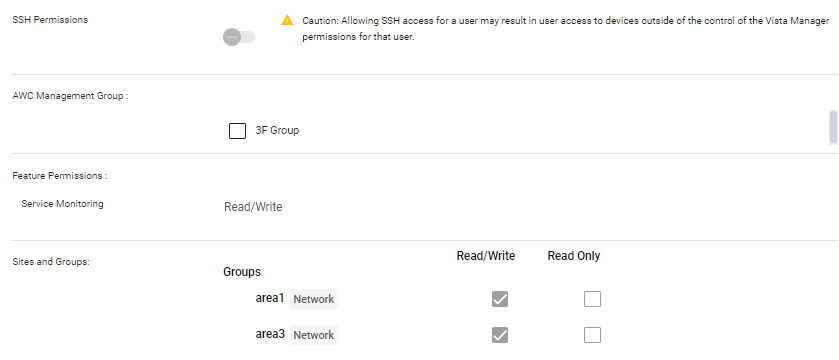 Permission controls on Vista Manager EX do not apply to operations in the CLI via SSH. In other words, when the SSH Permission is On, the user of the account can make configuration changes via the SSH to all AMF devices on the AMF network.