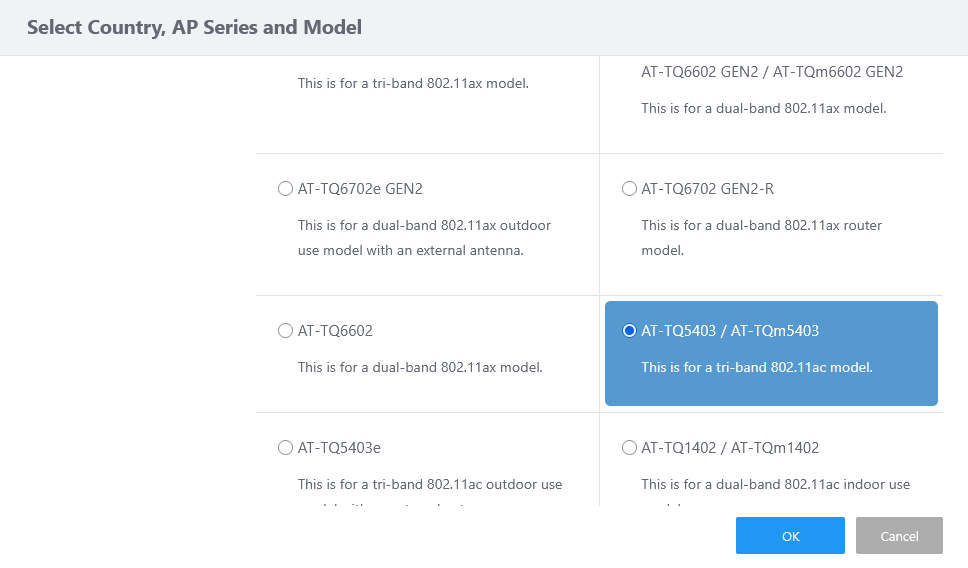 If you are configuring a Smart Connect network using the TQ6602 GEN2/TQ6702 GEN2, select "AT-TQ6702 GEN2 / AT-TQm6702 GEN2 AT-TQ6602 GEN2 / AT-TQm6602 GEN2". Refer to Operation Reference > Wireless Configuration > Configure AP Profiles for the setting items when "AT-TQ6702 GEN2 / AT-TQm6702 GEN2 AT-TQ6602 GEN2 / AT-TQm6602 GEN2" is selected.