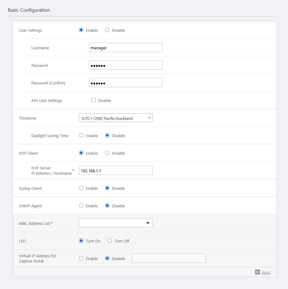 - You can specify the AP's system settings in the "Basic Configuration" section.